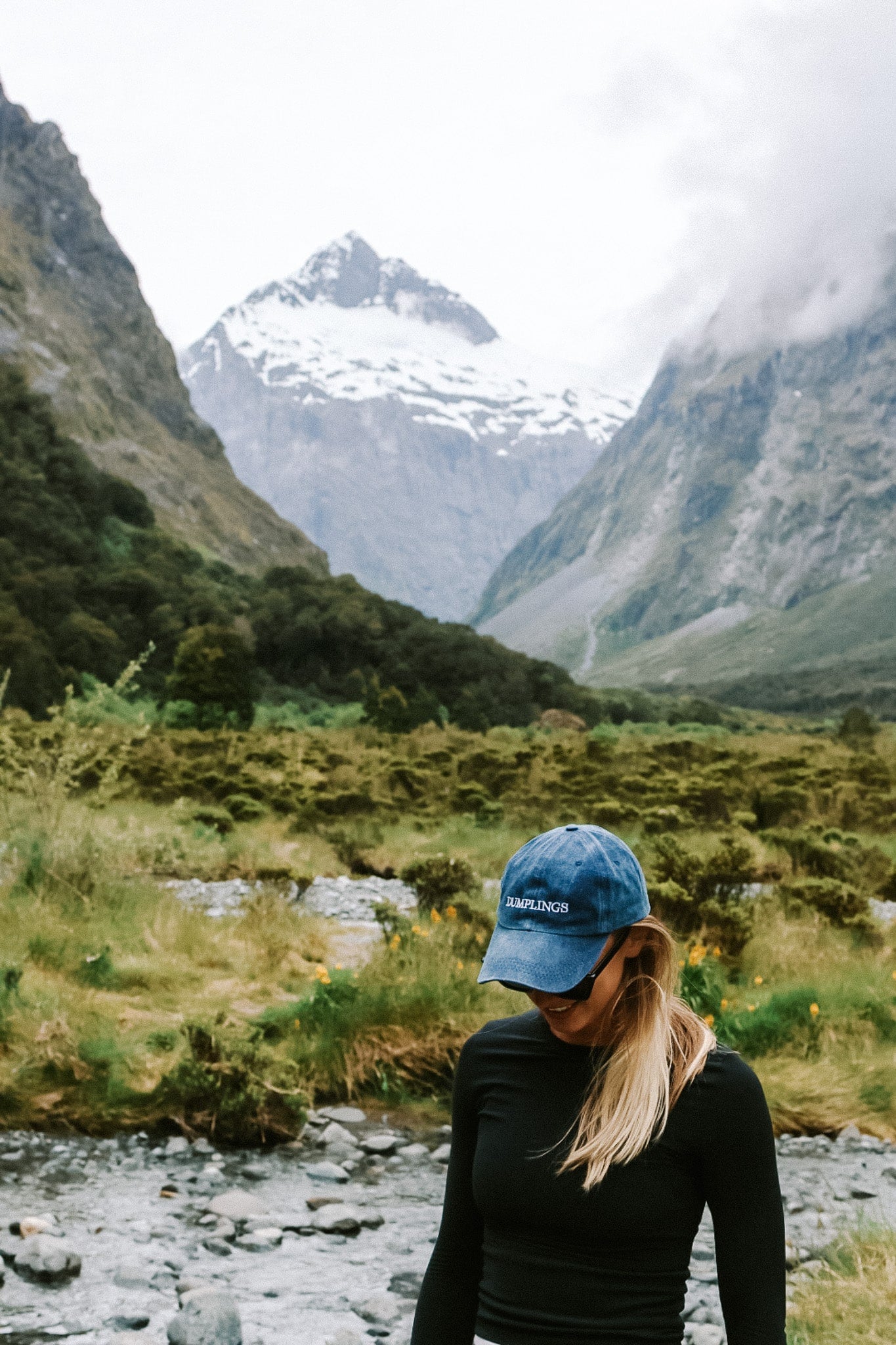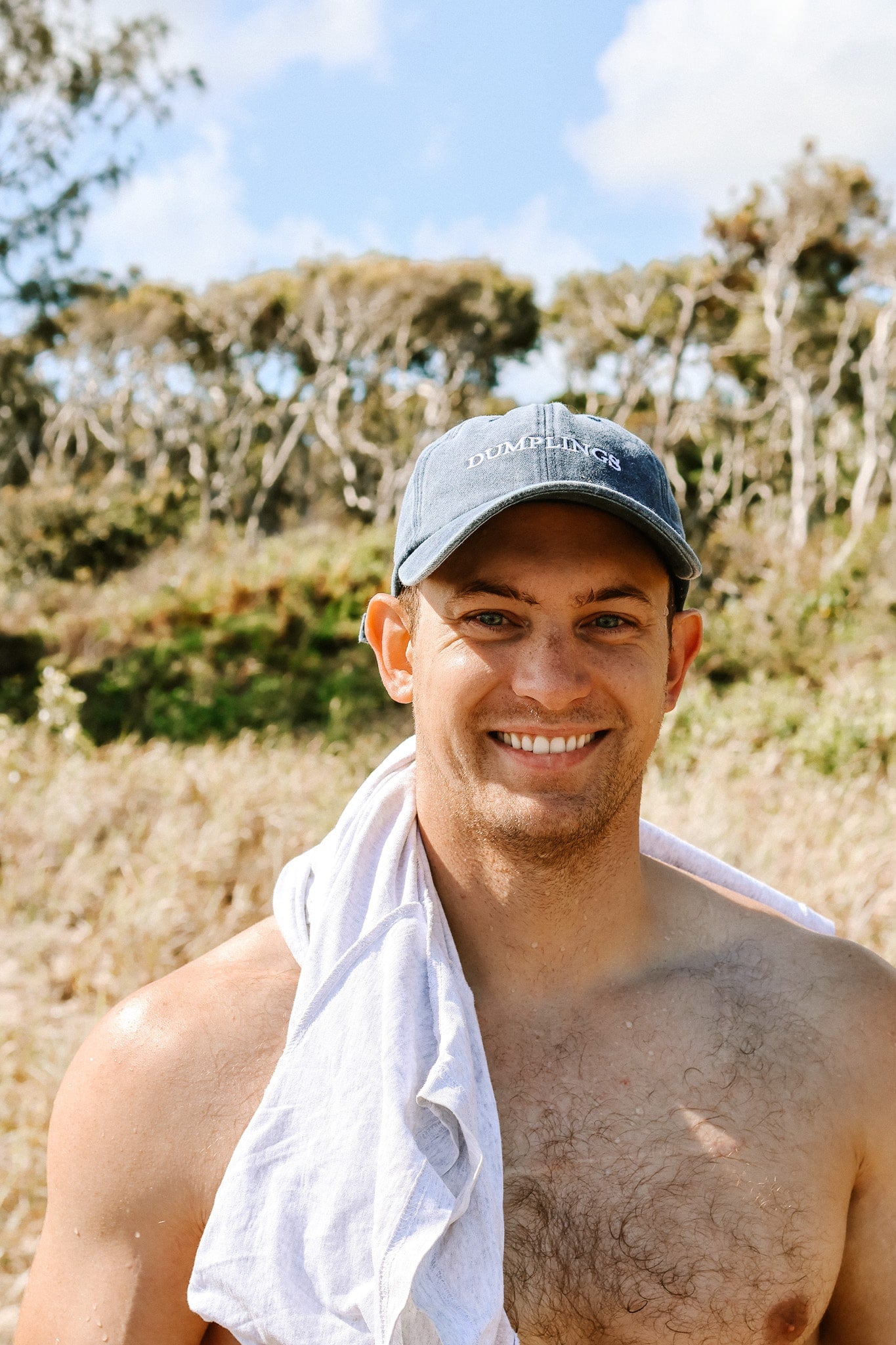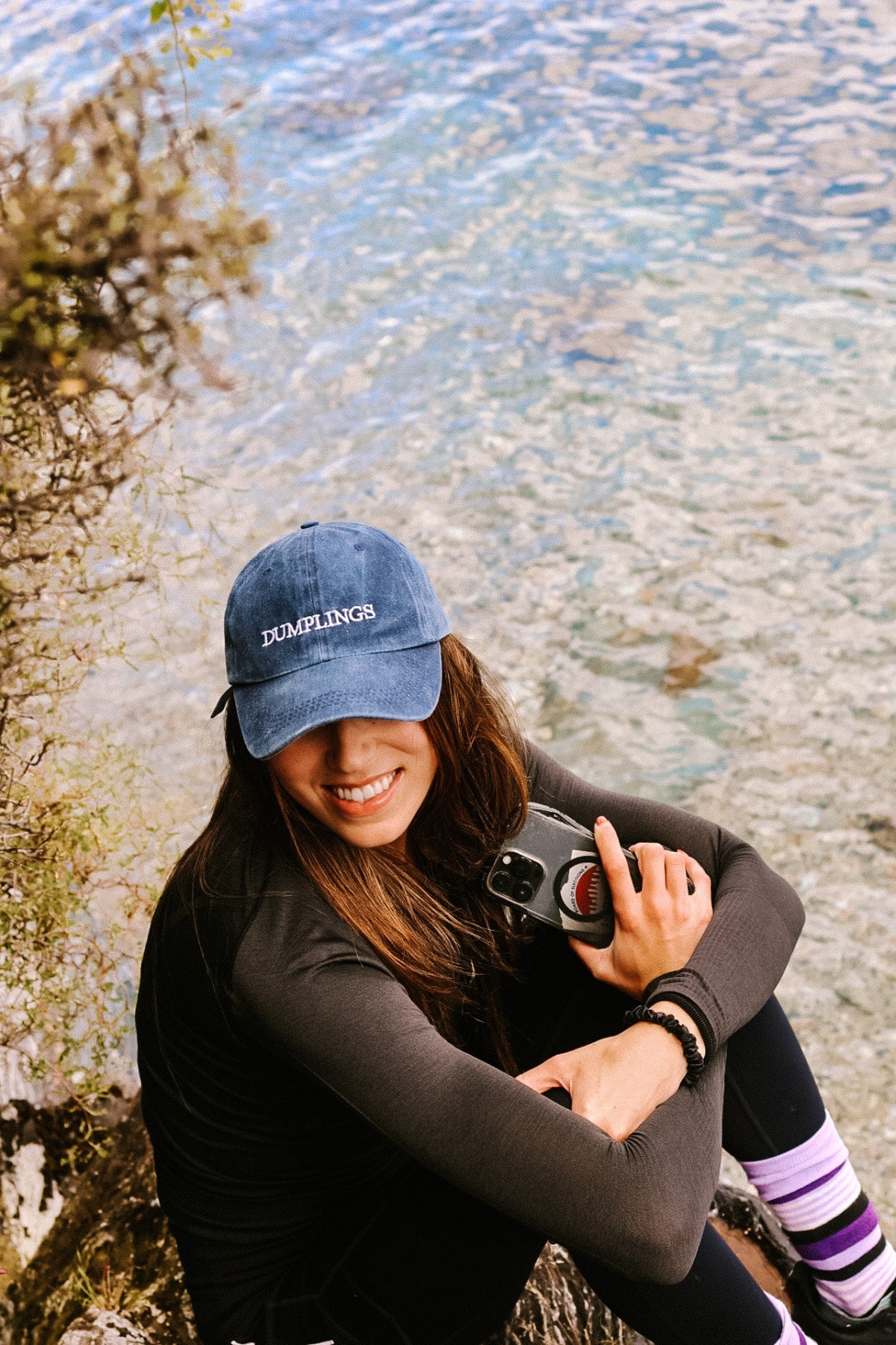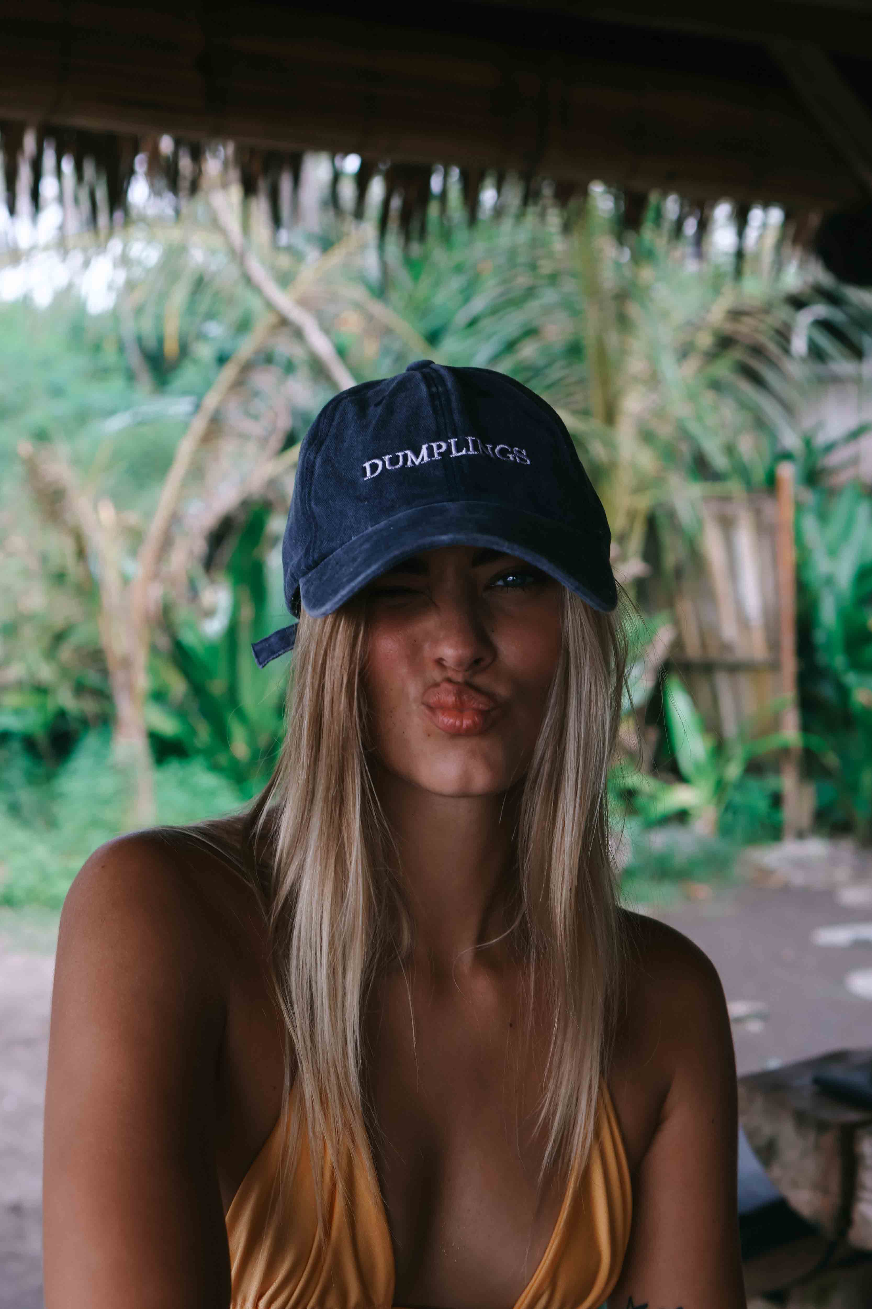 This is a navy hat with an acid wash finish, and it says 'DUMPLINGS'. Just cause.